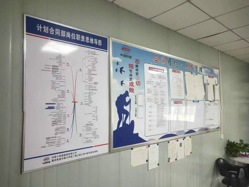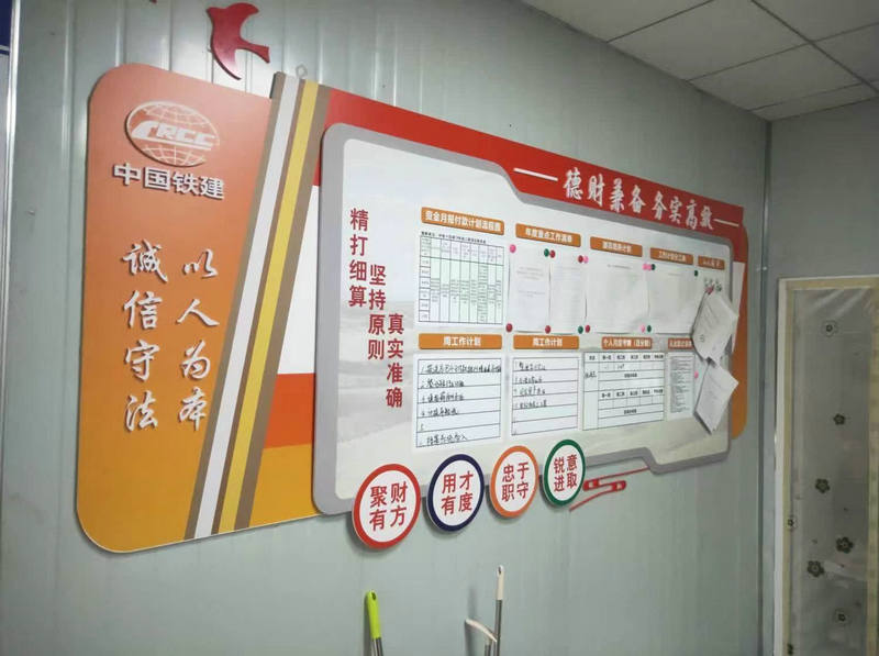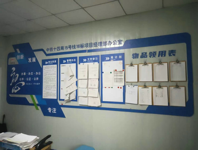 項(xiàng)目部室文化墻是工地文化長(zhǎng)廊的組成部分,由崗位職責(zé)、管理辦法、文件學(xué)習(xí)、周計(jì)劃、重點(diǎn)提示、團(tuán)隊(duì)風(fēng)采、每周一說等多個(gè)板塊組成,不同的部室所呈現(xiàn)的工作內(nèi)容也不盡相同。從整體布局及涉及部門和個(gè)人的工作內(nèi)容,均涵蓋了提高工作效率的審美情趣和價(jià)值取向。部室人員透過文化墻各個(gè)板塊、鎖定當(dāng)天的工作內(nèi)容和注意事項(xiàng),使個(gè)人和部門所落實(shí)、整改和匯報(bào)的等工作條款,不漏項(xiàng)、不缺項(xiàng)完整地實(shí)現(xiàn)過程管理,部室文化墻舉目所處是一個(gè)“大家庭”,每個(gè)工作內(nèi)容即是“家”的一分子,營(yíng)造出和諧誠(chéng)信、積極向上的“項(xiàng)目文化”,也是每一位“家人”所應(yīng)盡的責(zé)任“提醒板”。