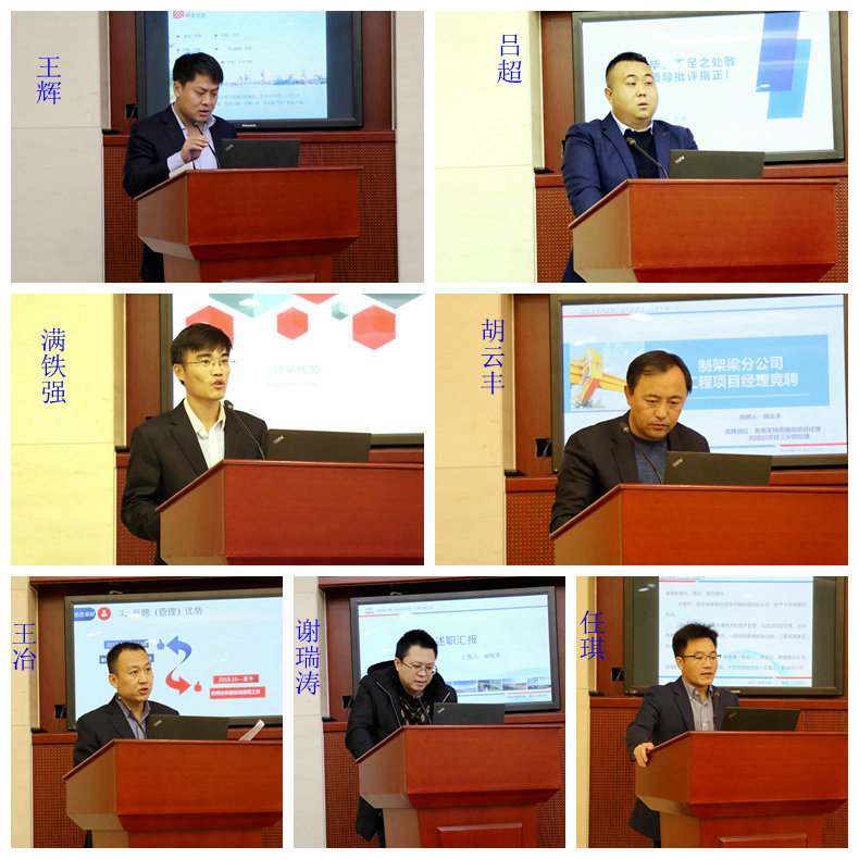 此次從初評中脫穎而出參加競聘大會的7名同志分別是王輝、呂超、滿鐵強(qiáng)、胡云峰、王冶、謝瑞濤、任琪。他們目前都是各自項(xiàng)目的班子成員,在生產(chǎn)副經(jīng)理、總工程師、制梁場場長等崗位任職。“我競聘的優(yōu)勢是……”“如果我競聘成功,我的工作思路是這樣的……”他們分別從任職履歷、工作經(jīng)驗(yàn)、工作思路和規(guī)劃等方面進(jìn)行競聘闡述。每名競聘者闡述完畢后在座評委針對人員管理、隊(duì)伍管理等具體問題進(jìn)行提問,由競聘者予以作答。