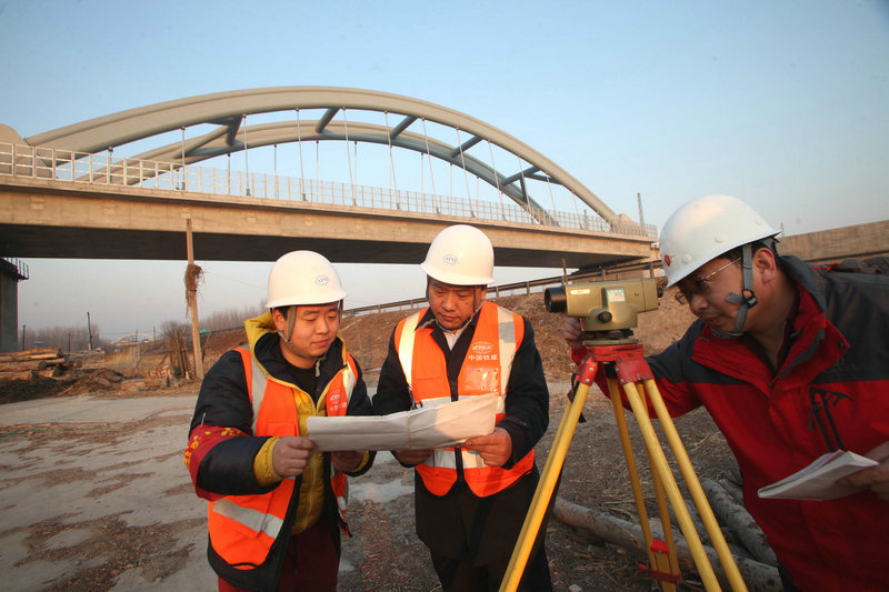 3、中鐵十八局集團(tuán)五公司建筑公司黨委書記胡興光(中)、唐曹鐵路項目副經(jīng)理劉小林(右)對跨唐津高速簡支梁進(jìn)行沉降復(fù)測(伍振 白雯 攝)