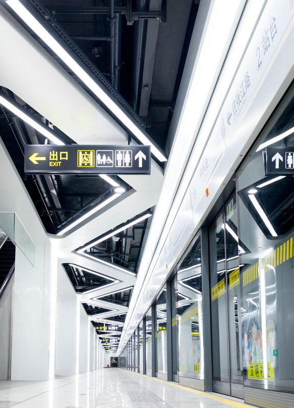 作為張江科技城的門戶車站,中科路站的裝修理念也是極具時代氣息。鏡面不銹鋼構(gòu)成的石墨晶體結(jié)構(gòu)吊頂,地面上鋪滿黑白相間的幾何圖形,站廳中央的巨幅LED大屏實時展示地鐵建設(shè)運營的最新動態(tài),機電設(shè)備房裝修與色彩交相呼應(yīng)。