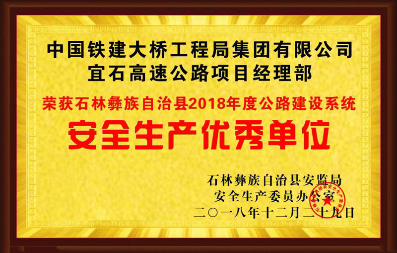 1月5日,中國(guó)鐵建大橋工程局集團(tuán)三公司宜石高速公路項(xiàng)目從眾多施工建筑企業(yè)中脫穎而出,在安全生產(chǎn)工作考評(píng)中,榮獲昆明市石林彝族自治縣安全生產(chǎn)委員會(huì)頒發(fā)的2018年度“安全生產(chǎn)優(yōu)秀單位”稱號(hào)。