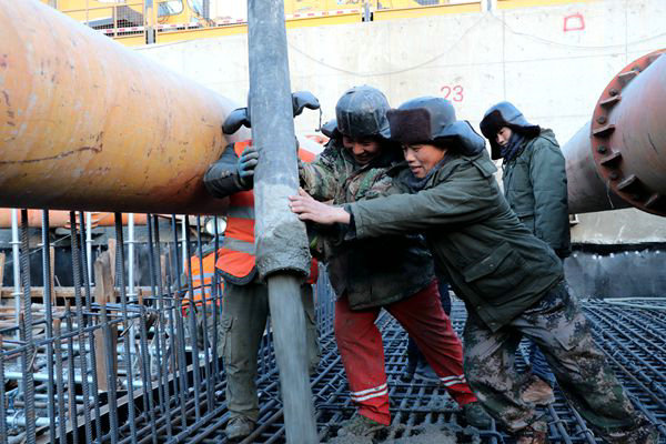 工區(qū)經(jīng)理蘇曉亮(左)和施工隊負責(zé)人鄭強在現(xiàn)場探討冬季混凝土施工技術(shù)