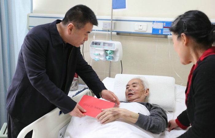 2019年春節(jié)即將到來(lái)之際,中鐵二十一局三公司對(duì)建國(guó)前入黨的老黨員進(jìn)行慰問,為他們送去公司黨組織的關(guān)懷和溫曖。圖為公司黨委副書記、紀(jì)委書記郝禮到醫(yī)院看望91歲的老黨員盧長(zhǎng)貴同志,并送上慰問金。 記者 尹登明 攝