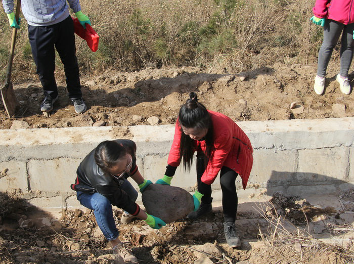 女青年清理滾石    志愿者們以雷鋒為榜樣,發(fā)揚(yáng)不怕苦、不怕臟、不怕累的精神,對(duì)周邊村落水溝兩邊的雜草、礦泉水瓶、易拉罐、泡沫等垃圾進(jìn)行了“拉網(wǎng)式”清除,同時(shí)對(duì)水溝里的石塊、淤泥進(jìn)行“掃蕩式”清理;女同胞們也是巾幗不讓須眉,干勁十足,揮舞著手中的鐵鍬,為活動(dòng)增加了一抹靚麗的風(fēng)景。在大家的共同努力下1.2公里的水溝及周邊環(huán)境被清掃的干干凈凈。一位參與活動(dòng)的團(tuán)員說(shuō),應(yīng)該經(jīng)常開(kāi)展這種形式的活動(dòng),這既能積極弘揚(yáng)雷鋒精神,同時(shí)也為創(chuàng)建文明生態(tài)環(huán)境盡一份力量、增一份光彩。