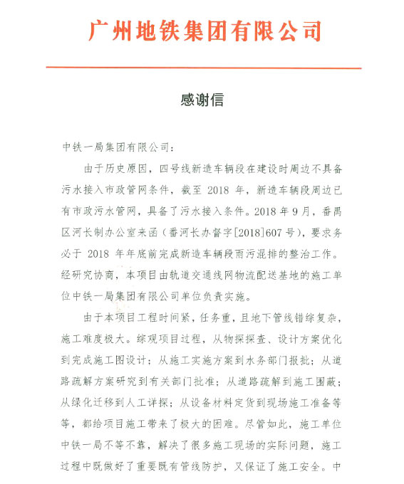?。◤V州訊)4月10日,廣州地鐵集團向中鐵一局集團發(fā)來感謝信,就中鐵一局建安公司參建員工在廣州地鐵4號線新造車輛段雨污混排整治工作中所表現(xiàn)出的強烈責(zé)任感和大局意識,以及在施工過程中所展現(xiàn)的攻堅克難能力提出表揚,對全體參建員工按時按質(zhì)安全完成施工任務(wù)表示感謝! 廣州地鐵4號線新造車輛段建設(shè)之初,周邊尚不具備污水接入市政管網(wǎng)條件。2018年9月接入條件成熟后,廣州市番禹區(qū)河長制辦公室要求2018年年底前必須完成車輛段雨污混排整治工作。 2018年9月,擔(dān)負廣州軌道交通線網(wǎng)物流配送基地施工任務(wù)的中鐵一局建安公司接到了廣州地鐵集團下達的施工任務(wù),全力以赴,確保在年底前實現(xiàn)車輛段雨污混排管道接入市政管網(wǎng)。 “這是一項環(huán)保工程,更是一項政治工程。”接到施工任務(wù)后,建安公司迅速組織精干人員跑步進場。當(dāng)時,前期的勘測、設(shè)計工作尚未完成,工程施工無法展開。面對困境,全體參建人員表現(xiàn)出了高度的大局意識和責(zé)任意識,通過抽調(diào)人員、設(shè)備參與人工詳探等形式,全力配合勘測、設(shè)計工作的開展。 工程開工后,面對工期緊,任務(wù)重的嚴峻形式,項目管理團隊精心組織生產(chǎn)、科學(xué)安排施工,克服了地下管線雜,交通疏解難,綠化遷移多等困難,通過倒排工期、合理組織交叉施工,采用人工開挖敷設(shè)排污管道等措施,全力以赴的搶抓施工進度。在此期間,項目管理團隊安全跨越跨越兩條高壓線、三條通訊光纖以及一條大口徑自來水供水管道,并于2018年12月份按時按質(zhì)完成施工任務(wù),并投入正常使用,得到了相關(guān)單位的一致好評!