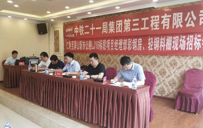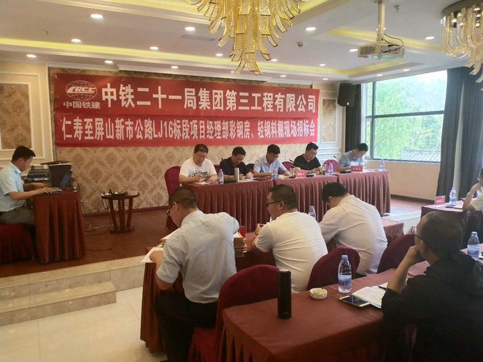 本網(wǎng)四川宜賓4月22日訊(記者 尹登明 通訊員 陳濤)剛剛上場的中鐵二十一局三公司仁沐新高速公路LJ16標(biāo)項(xiàng)目部,緊鑼密鼓地展開了各項(xiàng)工前準(zhǔn)備工作,為早日落成項(xiàng)目部辦公生活場所,在項(xiàng)目部臨時(shí)駐地屏山縣中都鎮(zhèn)召開了彩鋼房及輕鋼料棚招標(biāo)會(huì)議。