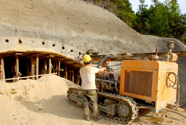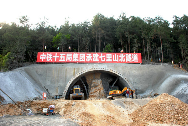 該隧道全長251米,是修水境內(nèi)9.188公里國道擴(kuò)建項(xiàng)目唯一的隧道,地質(zhì)為煤矸石,施工中易發(fā)生塌方。2月28日開工后,采取清表、挖掘機(jī)、鏟車、翻斗車等機(jī)械設(shè)備合力進(jìn)行前期土石方攻堅(jiān),并制定了可行性較強(qiáng)的施工預(yù)案。同時調(diào)集空壓機(jī)、噴錨機(jī)等設(shè)備為進(jìn)洞施工創(chuàng)造條件。4月13日,進(jìn)口端在完成明洞開挖、剛拱架作業(yè)、鋼筋混凝土施工等程序后,順利進(jìn)入下一道洞內(nèi)掘進(jìn)