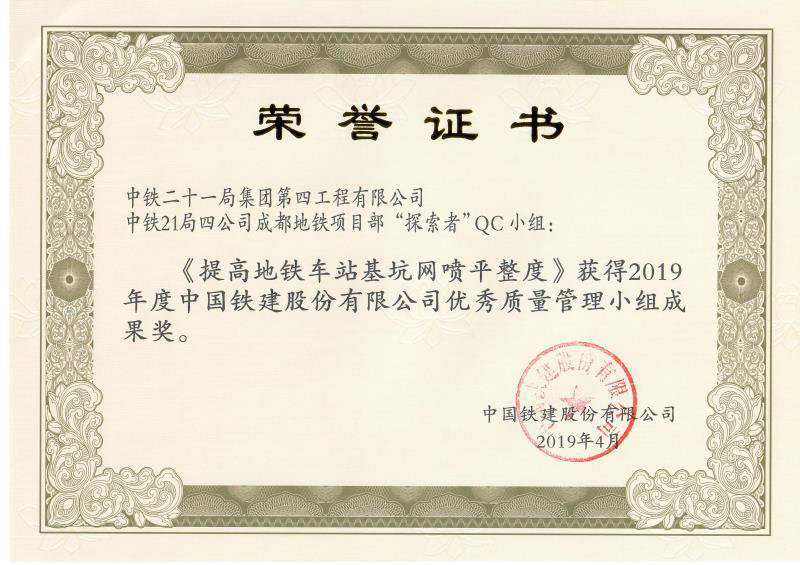 近日,中鐵二十一局四公司成都地鐵6號線土建7標(biāo)項(xiàng)目部“探索者”QC小組發(fā)布的《提高地鐵車站基坑網(wǎng)噴平整度》QC成果獲2019年度中國鐵建股份有限公司優(yōu)秀質(zhì)量管理小組活動(dòng)成果獎(jiǎng)。