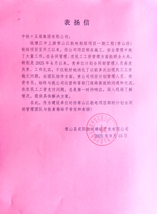 鐵路工程建設(shè)網(wǎng)訊 9月15日下午,中鐵十五局集團(tuán)常山江航電樞紐項目收到常山縣定陽航運(yùn)開發(fā)建設(shè)有限公司一份表揚(yáng)信,贊揚(yáng)該項目在勞務(wù)管理中作出的突出成績。