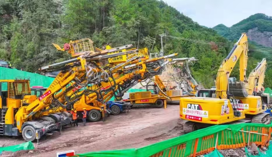 據(jù)中鐵十一局宜涪高鐵項目負責人張光武介紹,面對極其復(fù)雜的地質(zhì)和生態(tài)環(huán)境挑戰(zhàn),項目團隊堅持“技術(shù)先行、智能賦能、綠色施工”理念,多措并舉推進工程建設(shè)。項目廣泛應(yīng)用BIM+GIS技術(shù)進行三維可視化建模,實現(xiàn)施工方案模擬優(yōu)化與資源精準配置。洞口設(shè)立智能信息化控制中心,集成人員定位、瓦斯監(jiān)測、三維可視化超前地質(zhì)預(yù)報、智能鉆爆、智能車輛調(diào)度等系統(tǒng)。智能化裝備方面。引入全電腦三臂鑿巖臺車、拱錨一體臺車、鉆錨注臺車及混凝土噴漿機等智能裝備集群,形成全流程機械化作業(yè)鏈。