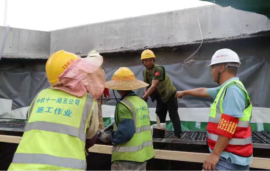 “黨員安全質(zhì)量監(jiān)督崗”崗長張盛偉(右1)在金山寺站施工中堅(jiān)持旁站監(jiān)督安全質(zhì)量和進(jìn)度