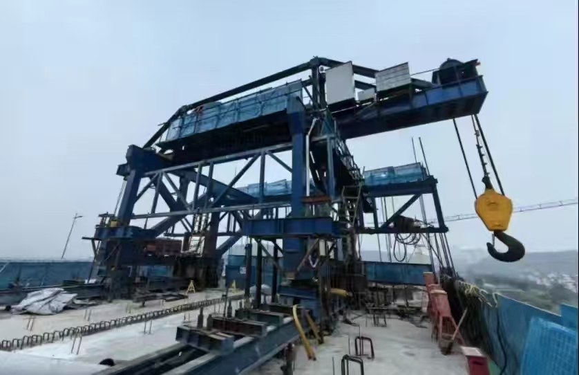 大橋采用鋼斜撐空腹連續(xù)剛構(gòu)的結(jié)構(gòu)形式,在國內(nèi)軌道交通橋梁建設(shè)中尚屬首例,鋼混混合式剛構(gòu)橋常規(guī)施工方法為先施工下弦鋼斜撐節(jié)段,后施工對(duì)應(yīng)的上弦混凝土節(jié)段,施工周期長,上下交叉作業(yè)安全風(fēng)險(xiǎn)高,且普通掛籃結(jié)合汽車起重機(jī)吊裝易受施工空間限制,經(jīng)濟(jì)性差。為研發(fā)“大橋掛吊一體裝置”關(guān)鍵技術(shù),總承包部副指揮長兼總工程師楊振在總承包部指揮長李兵、黨支部書記王向平等領(lǐng)導(dǎo)的重視支持下,他組織由中國鐵建重慶軌道交通15號(hào)線總承包部、中鐵建重慶投資集團(tuán)、重慶交通大學(xué)、中鐵建大橋局集團(tuán)三公司等單位聯(lián)合組成的科技研發(fā)團(tuán)隊(duì),圍繞“大橋掛吊一體裝置關(guān)鍵技術(shù)研究”課題立項(xiàng)研發(fā)。經(jīng)過團(tuán)隊(duì)探索研究,掛吊一體裝置在掛籃主桁架上方設(shè)置一臺(tái)吊機(jī)形成吊裝系統(tǒng),吊裝系統(tǒng)包含天車及吊具系統(tǒng),可用于下弦鋼斜撐吊裝施工;通過對(duì)掛籃的改進(jìn),同時(shí)滿足上弦箱梁和下弦鋼斜撐施工。