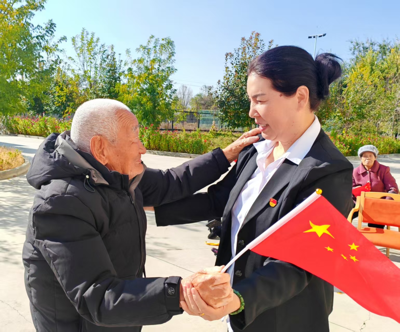 圖2為:第六師奇臺110團社區(qū)吾家樂寶養(yǎng)老院史云智,與在院97歲老爺爺張振民,在中秋佳節(jié)即興跳舞同樂。
