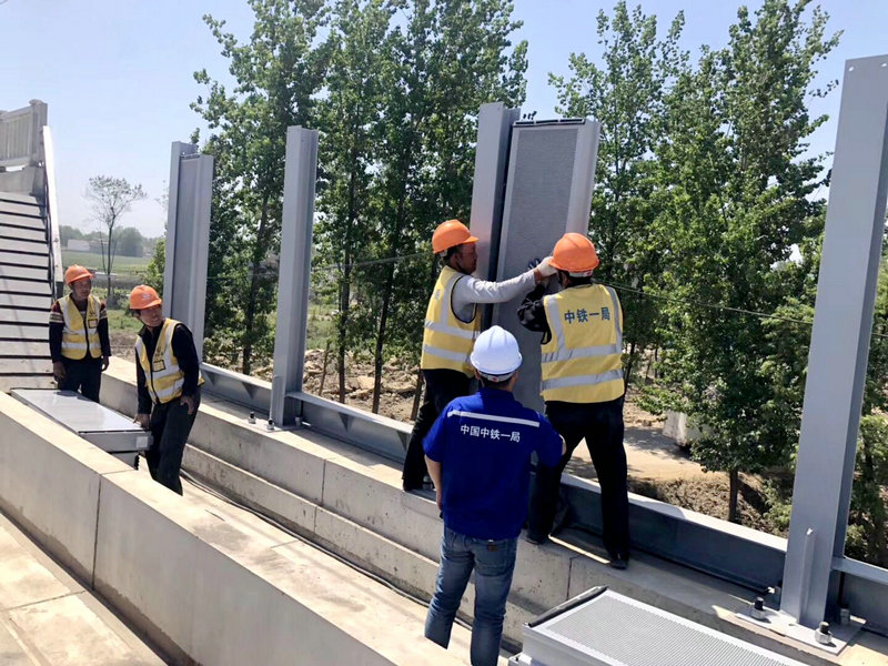 5月1日上午9時(shí)許,走進(jìn)位于鄭阜高鐵五標(biāo)段沈丘北站附近施工現(xiàn)場(chǎng),工人們正在安裝聲屏障。據(jù)了解,沈丘北站路基段全長(zhǎng)1500米,由于部分鐵路途經(jīng)居民區(qū),為減少列車經(jīng)過(guò)時(shí)造成的噪聲污染,保障鐵路沿線居民的生產(chǎn)、生活質(zhì)量,按照設(shè)計(jì)安裝了聲屏障。聲屏障采用鋁合金吸聲板,高2.3米,覆蓋的有效區(qū)域平均降噪可達(dá)30分貝以上。聲屏障基礎(chǔ)采用挖孔樁,工人在基坑下邊干活頗為辛苦。