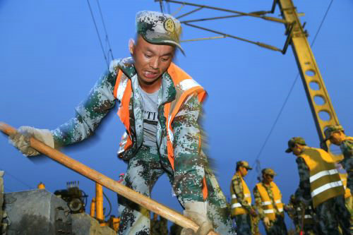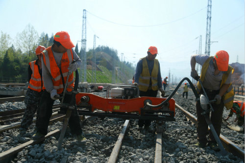 面對既有線施工難度大,人工鋪軌作業(yè)交叉頻繁,工期節(jié)點步步緊逼等系列困難,項目部全體參建員工嚴格按照“高標準,嚴要求,不懈怠”的精神目標,上頂壓力,下克困難,不分節(jié)假,晝夜開工,全面掀起大干快上熱潮。