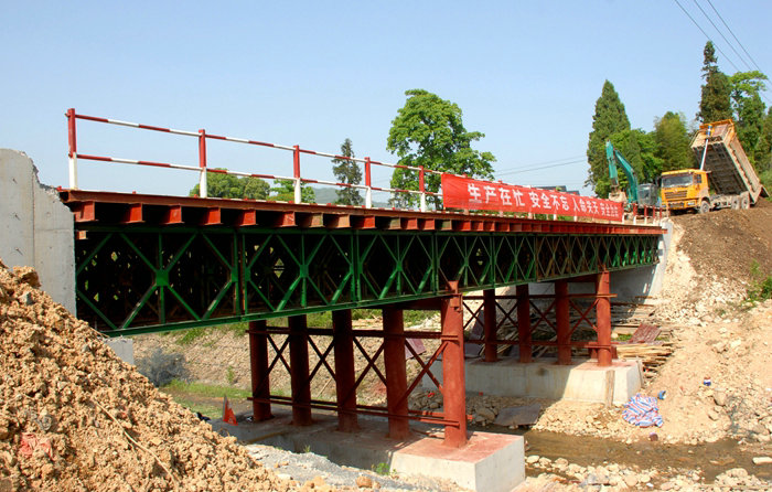 原竹坪橋和杭口橋全長(zhǎng)71米。改建后的竹坪橋長(zhǎng)37.54米、高4米、寬40米,杭口橋長(zhǎng)44.04米、寬40米、高8米。這兩座橋在建設(shè)過(guò)程中,為節(jié)省成本,項(xiàng)目部有關(guān)人員將自建與租賃的成本作了反復(fù)計(jì)算和對(duì)比,租賃要比自建劃算許多,兩座橋可節(jié)省幾十萬(wàn)元,于是采取租用的辦法由廠家運(yùn)輸材料,組織人力和設(shè)備架設(shè)7米寬的鋼便橋,以解決拆舊橋,車(chē)輛正常通行問(wèn)題。剛竣工的兩座鋼便橋,由工字鋼、厚鋼板、圓鋼管等材料組成,結(jié)構(gòu)科學(xué)合理、安全便捷,可承載大貨車(chē)壓力。