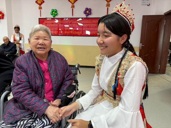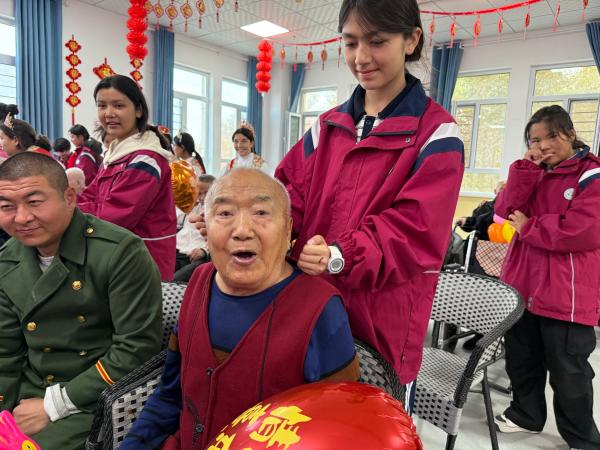 活動現(xiàn)場暖意融融。師生們精心準(zhǔn)備了具有民族特色的維吾爾族舞蹈,靈動的舞姿、歡快的旋律贏得了長者們陣陣掌聲,不少老人跟著節(jié)奏輕輕拍手,臉上洋溢著喜悅的笑容,養(yǎng)老院里瞬間充滿了歡聲笑語。表演結(jié)束后,師生們迅速切換“志愿模式”,有的拿起掃帚、抹布,認(rèn)真清掃養(yǎng)老院庭院的落葉與雜物;有的學(xué)生則主動走到長者身邊,輕聲細(xì)語地詢問身體狀況,為他們捶背捏肩,用嫻熟又輕柔的動作緩解長輩們的疲憊。
