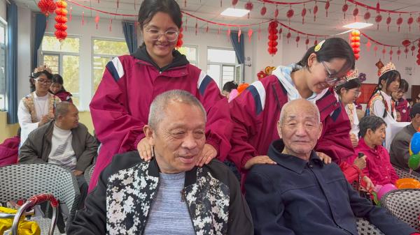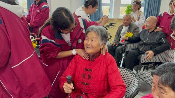 在親切的嘮家常環(huán)節(jié),學(xué)生們圍坐在長者身旁,傾聽他們講述過去的故事,分享生活中的趣事。一張張笑臉、一聲聲問候,讓整個養(yǎng)老院都沉浸在溫馨和睦的氛圍里,也讓長者們在重陽佳節(jié)感受到了如同家人般的陪伴與關(guān)愛。