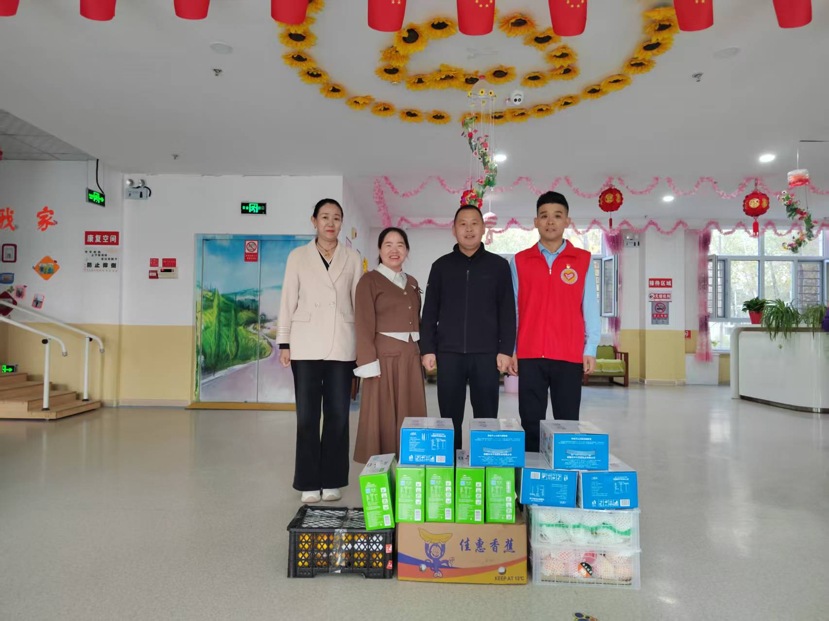 迎賓路社區(qū)領(lǐng)導(dǎo)便帶著沉甸甸的關(guān)懷走進養(yǎng)老院。他們親手將精心準(zhǔn)備的慰問品送到老人們手中,一箱箱營養(yǎng)豐富的牛奶、一串串飽滿香甜的香蕉,不僅是物質(zhì)上的補給,更承載著對長者們的深切關(guān)愛。老人們接過慰問品,臉上洋溢著幸福的笑容,不停地向領(lǐng)導(dǎo)們道謝,現(xiàn)場氛圍瞬間被溫暖籠罩。