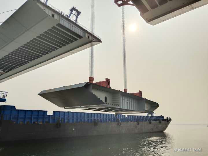 “大橋主橋北邊跨混凝土箱梁施工是大橋建設(shè)的一個(gè)重要難點(diǎn),過去,箱梁都是在空中平臺(tái)上現(xiàn)場(chǎng)制作、現(xiàn)場(chǎng)拼裝。為進(jìn)一步提升工程質(zhì)量,石首長(zhǎng)江公路大橋北邊跨首次采取了地面預(yù)制、空中拼裝的施工方法。北邊跨需要使用36片梁,每片梁寬38.5米、長(zhǎng)5至7米不等、高約4米,梁段最重近1100余噸,把這么一個(gè)龐然大物從地面吊到高幾十米的支架上,再進(jìn)行拼裝,誤差不能超過2毫米。”項(xiàng)目經(jīng)理中國(guó)鐵建大橋局李春江向記者介紹到。
