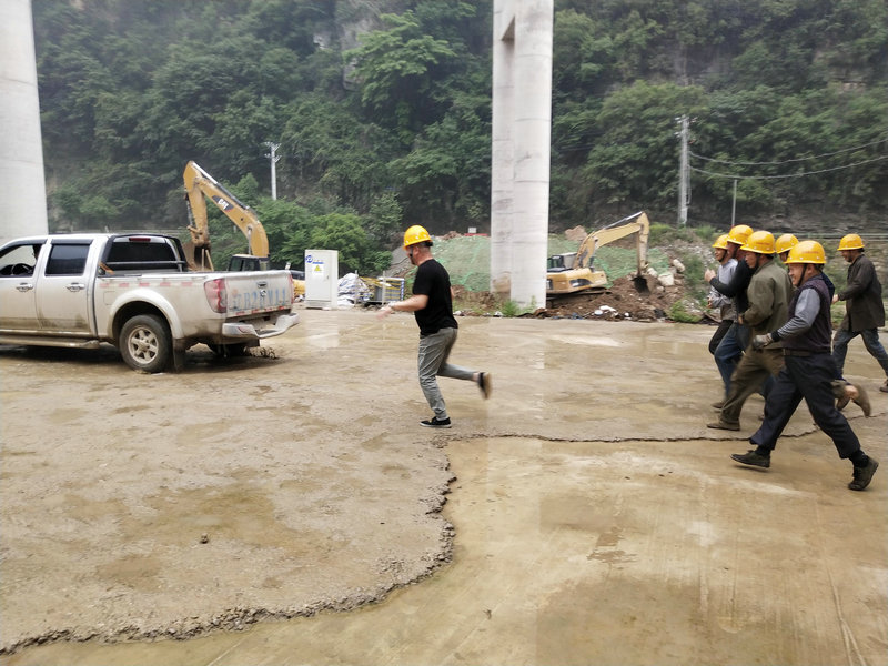 此次演練采用實(shí)戰(zhàn)演練方式,模擬霧渡河上游突降大雨,霧渡河水位報(bào)警裝置發(fā)出報(bào)警信息,水勢迅猛,危及項(xiàng)目施工現(xiàn)場。工區(qū)經(jīng)理高俊龍接到報(bào)警迅速發(fā)布撤離信息,安排預(yù)警監(jiān)控組人員迅速到沿河道往上游查看水情,并立即安排部署人員準(zhǔn)備沙袋,將沙袋堆放在廠區(qū)門口,安排挖機(jī)疏通河道,并準(zhǔn)備好應(yīng)急物資及應(yīng)急藥品。
