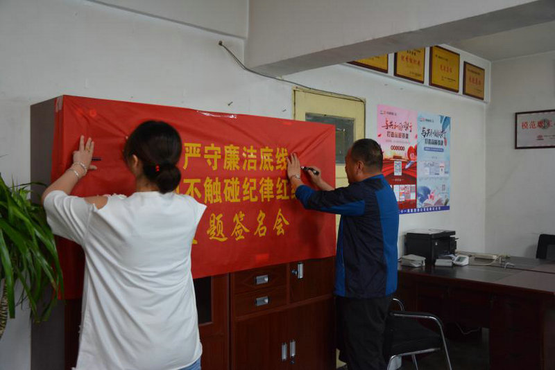 會后,還舉行了“嚴(yán)守廉潔底線,絕不觸碰紀(jì)律紅線”主題簽名活動,機(jī)械化公司全體職工在紅幅上留下了自己的名字。經(jīng)理李鯤說到:簽字意味著對自己的承諾,對黨的承諾,寧可清貧自樂,不可濁富多憂,大家要更加認(rèn)識到紀(jì)律的重要性,把握好正確的人生方向。