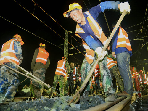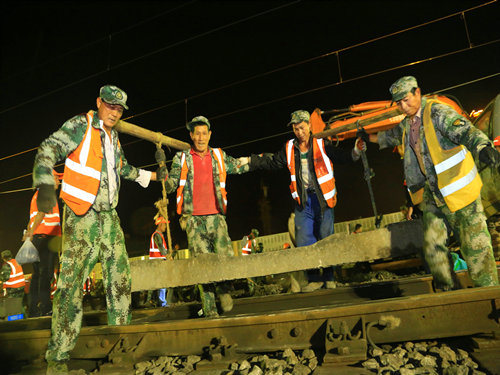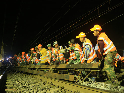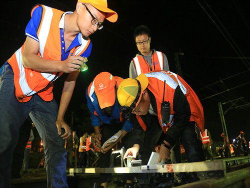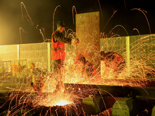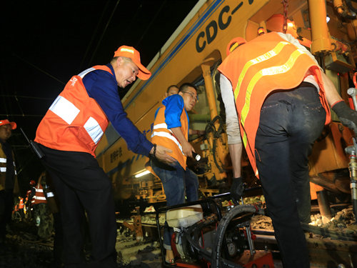 “調(diào)度命令已下達(dá),開始作業(yè)!”當(dāng)晚21時00分,施工負(fù)責(zé)人一聲令下,準(zhǔn)備多時的“鐵醫(yī)生”們?nèi)珉x弦之箭,迅速沖上線路,發(fā)動馬達(dá)、拆卸夾板,安裝切軌機(jī)......一時間,指揮聲、吶喊聲、機(jī)器轟鳴聲頓時響徹整個施工現(xiàn)場。