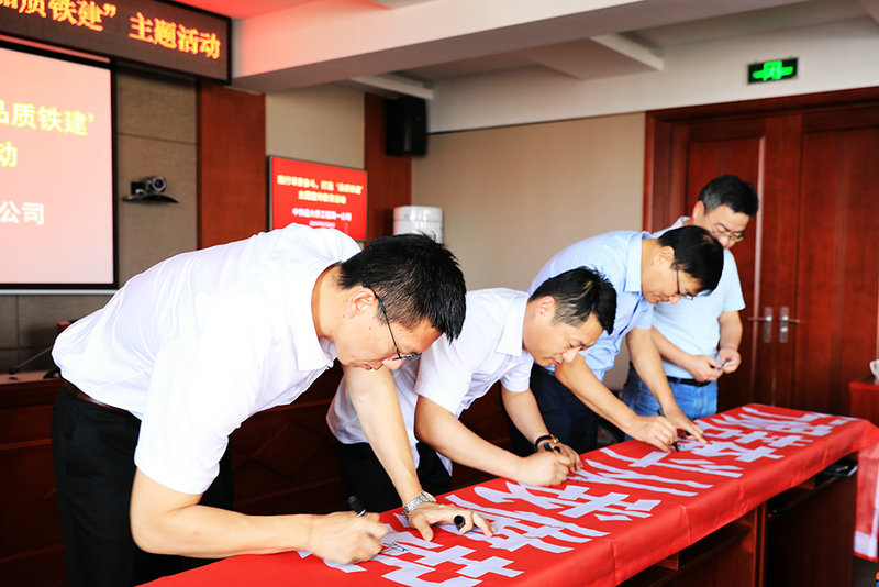 5月24日,中鐵建大橋工程局一公司機(jī)關(guān)及26個(gè)項(xiàng)目部管理人員及施工隊(duì)伍代表1000多人,鄭重地在寫有“踐行艱苦奮斗從我做起,打造“品質(zhì)鐵建”我在行動(dòng)”宣傳條幅上簽名,拉開一公司開展此項(xiàng)活動(dòng)的序幕。
