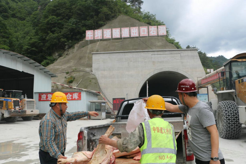 圖為給隧道施工隊(duì)伍送豬肉等慰問(wèn)品