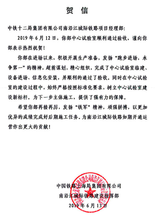 中國鐵路工程建設(shè)網(wǎng)訊(通訊員 謹 愚)6月13日,擔負南沿江城際鐵路6標段施工任務(wù)的中鐵十二局集團項目經(jīng)理部自組織隊伍上場以來,不能不靠,主動與地方相關(guān)部門接洽,積極籌備,贏得中國鐵路上海鐵路局集團有限公司南沿江城際鐵路建設(shè)指揮部組建以來的第一封賀信。賀信中說:你部進場以來,超前謀劃,精心組織,完成了中心試驗室臨建、設(shè)備進場、信息化安裝,并順利的通過了驗收,樹立了中心試驗室建設(shè)的新標桿!