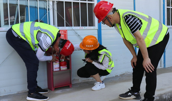 圖為檢查安全防火設施 與此同時,項目部配合地方政府走上街頭,向群眾發(fā)放傳單,宣講安全常識,每周進行一次例行安全隱患排查,主要對管區(qū)、生活區(qū)滅火器、電源開關箱、宿舍照明線路、拌合樓樓梯的安全防護等進行隱患排查。項目主管領導抓落實。并逐級簽定安全責任狀,把各種安全規(guī)章制度和措施真正落實到每個節(jié)點上,使之變成參建員工自覺重視安全的行動。安質部人員在現(xiàn)場講解安全卡控要點,對安全工作小題大作,把不安全苗頭當做大事抓,使員工牢記“安全無小事”的思想意識,始終繃緊安全生產(chǎn)這根弦。