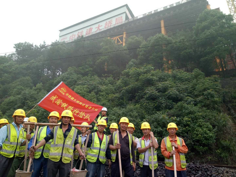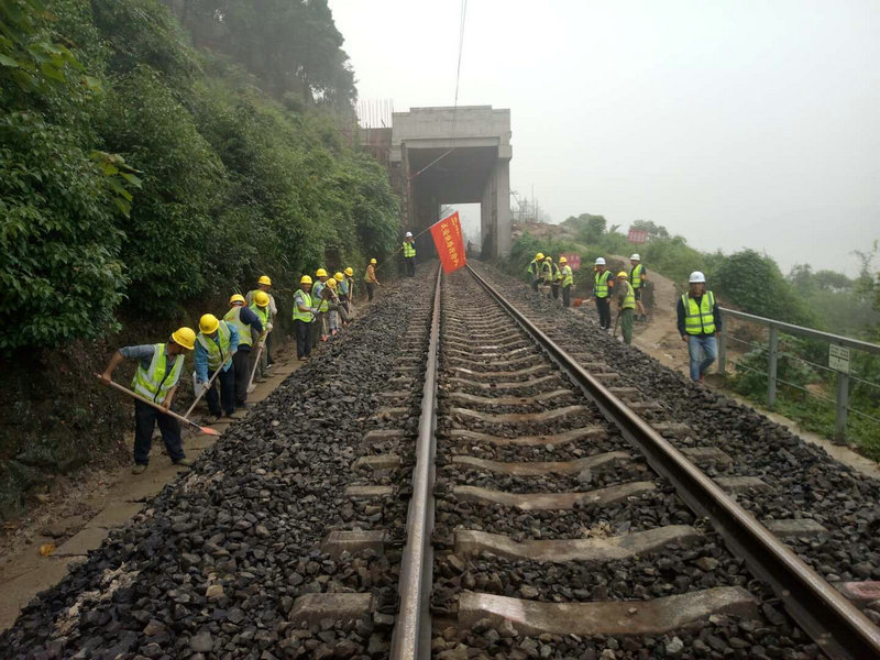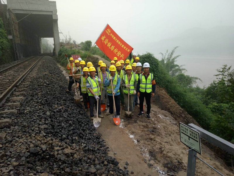 由于情況緊急,鐵路部門已封閉鐵路,暫停通車,并向我單位請求支援。我單位接到鐵路部門求援后,立即啟動抗洪搶險應(yīng)急預(yù)案,停止一切施工,組織現(xiàn)場全體人員組成搶險隊,趕赴救援現(xiàn)場,配合鐵路部門進行搶險工作。由于此段鐵路緊鄰山體和長江,一切救援車輛和物資均無法到達(dá)搶險現(xiàn)場,搶險隊員迅速克服一切困難,就地取材,采用人工堆碼沙袋的方法加固沖垮的路基邊坡,保護好通信電纜,采用手提和肩挑橡膠桶的方式清理水溝的泥沙。