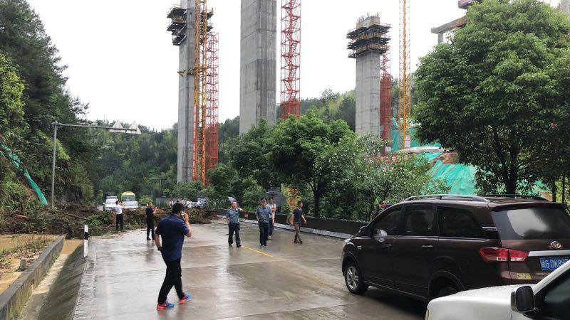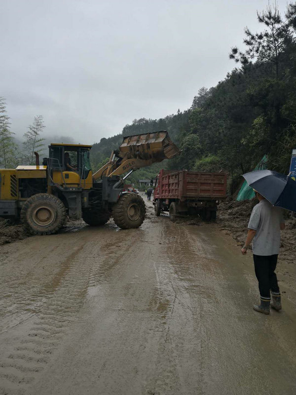 下午14時(shí),306省道發(fā)生二次泥石流山體塌方事故,沿線大大小小共計(jì)10處道路邊坡滑坡,造成堵塞交通。項(xiàng)目再次出動(dòng),緊急組織26名抗洪搶險(xiǎn)突擊隊(duì)成員、2臺(tái)鏟車、1臺(tái)挖機(jī)、5臺(tái)自卸車、1臺(tái)灑水車、立即趕往事故發(fā)生地進(jìn)行搶修,三明市廣平鎮(zhèn)政府、派出所、大田管理處、YJ5總監(jiān)辦監(jiān)理相關(guān)領(lǐng)導(dǎo)聞?dòng)嵑蠹皶r(shí)趕到現(xiàn)場(chǎng),參與到抗洪搶險(xiǎn)的隊(duì)伍中。此時(shí),狂風(fēng)暴雨,電閃雷鳴,現(xiàn)場(chǎng)搶險(xiǎn)工人沒有一個(gè)人退縮,干勁十足么,但雨量大,來速快,洪水來勢(shì)兇猛,一輛挖掘機(jī)正在處理堵塞道路時(shí),山體再次垮塌,泥石流一涌而下,司機(jī)師傅迅速做出反應(yīng),跳下操作駕駛位,但巨大的沖擊力將挖掘機(jī)沖到道路對(duì)面山溝下,險(xiǎn)釀成人員傷亡事故。此時(shí),如果不迅速清理堵塞,將邊坡加固,那么危險(xiǎn)將隨時(shí)可能發(fā)生,廣平鎮(zhèn)政府搶險(xiǎn)工作組與項(xiàng)目部研究后決定集中人力物力深入抗洪救災(zāi),快速完成搶險(xiǎn)工作,項(xiàng)目增加19名突擊隊(duì)隊(duì)員、2臺(tái)鏟車、6臺(tái)自卸車、1臺(tái)灑水車、1臺(tái)180噸吊車,聯(lián)合地方救援力量,爭分奪秒,冒雨奮戰(zhàn)了近6個(gè)小時(shí),終于完成了清理道路、加固邊坡堤身的搶險(xiǎn)任務(wù),及時(shí)化解險(xiǎn)情,恢復(fù)現(xiàn)場(chǎng)道路交通。