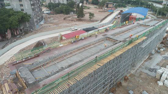 本聯(lián)現(xiàn)澆梁采用盤(pán)扣式滿(mǎn)堂支架法施工,全長(zhǎng)75米,寬8.5米。本次澆筑歷時(shí)6小時(shí),共澆筑混凝土480方。福州近期適逢雨季,為確保按期澆筑,項(xiàng)目部帶領(lǐng)隊(duì)伍晝追夜趕,冒雨施工,完成了澆筑前的各項(xiàng)準(zhǔn)備工作。在澆筑前一天,項(xiàng)目進(jìn)行了詳細(xì)認(rèn)真的技術(shù)與安全交底,將整個(gè)澆筑過(guò)程涉及到的砼供應(yīng)、機(jī)械保障、人員保障、調(diào)度管理等工作層層分解,每個(gè)點(diǎn)責(zé)任到人,技術(shù)到人,扎扎實(shí)實(shí)地把每個(gè)點(diǎn)管控到位,由點(diǎn)及面,澆筑工作也一氣呵成。