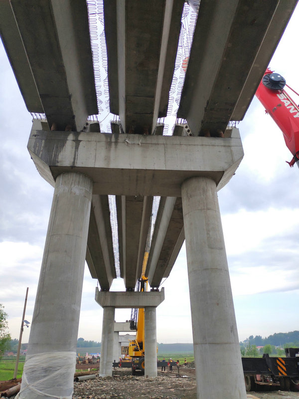 據(jù)了解,該橋全長281.08米, 橋面寬8米,兩側(cè)設(shè)置0.5米寬防撞墻,共計箱梁37片。其中第8孔跨越既有濱綏鐵路,線間距為4.25米,軌面至梁底的高度為6.8米。上部結(jié)構(gòu)采用2-20米+5-25米+30米+4-20米預力混凝土簡支小箱梁,梁高1.6米。頂寬中梁2.4米、邊梁2.4米,底寬1.0米。下部結(jié)構(gòu)采用柱式橋墩,鉆孔灌柱樁基礎(chǔ),橋墩柱直徑1.3米,橋墩樁基直徑1.5米??缇€孔柱徑1.4米、樁徑1.6米,樁基類型為摩擦樁。橋臺采用肋板式橋臺,工字型承臺,樁基礎(chǔ),樁徑為1.2米。橋墩均設(shè)置地系梁橫向聯(lián)結(jié),全橋蓋梁采用鋼筋混凝土結(jié)構(gòu)。