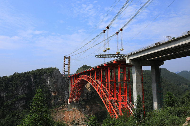 在建設(shè)過程中,項目技術(shù)人員進行技術(shù)創(chuàng)新,確保施工質(zhì)量和安全。大橋采用“纜索吊機斜拉扣掛法”施工,根據(jù)地形條件,設(shè)計建造了兩個高65.2米和55.2米的纜塔,沒有風(fēng)纜,通過合理設(shè)計扣點和吊點,確保大橋合龍精度;為降低施工安全風(fēng)險,在吊裝第7個節(jié)段時進行提前封鉸,使大橋的“根”固定,減少擺動;找龍壩河特大橋拱上立柱是鋼結(jié)構(gòu),由外法蘭盤改成內(nèi)法蘭盤栓接后再外包鋼板焊接,使上下節(jié)段立柱成為整體,便于現(xiàn)場施工和線型控制,外形美觀。