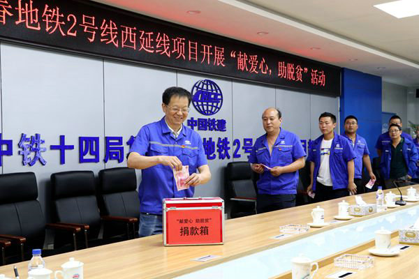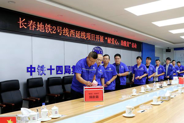 中國(guó)鐵路工程建設(shè)網(wǎng)訊(通訊員 蘭彩霞)為積極響應(yīng)集團(tuán)公司、公司的號(hào)召,7月4日下午3:00,中鐵十四局集團(tuán)長(zhǎng)春地鐵2號(hào)線西延項(xiàng)目部黨支部舉行了“獻(xiàn)愛(ài)心,助脫貧”捐款活動(dòng)。