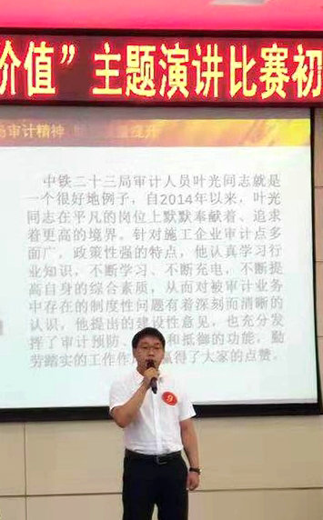 “一名優(yōu)秀的審計(jì)工作者,必須時(shí)刻用審計(jì)精神激勵(lì)自己,實(shí)事求是、堅(jiān)持原則,用奉獻(xiàn)精神為企業(yè)發(fā)展保駕護(hù)航,因?yàn)槲覀兊囊谎砸恍写碇鴮徲?jì)部門的形象……”這是7月11日,在中國鐵建股份有限公司舉辦的“助力品質(zhì)鐵建、彰顯審計(jì)價(jià)值”主題演講比賽(西安賽區(qū))上,代表中鐵二十三局集團(tuán)參賽的二公司哈牡電氣化項(xiàng)目部財(cái)務(wù)部黨哲激情演講的開場白。