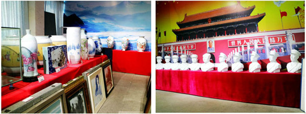 出了接待間,在展廳的進(jìn)門位置,一尊毛澤東塑像擺在迎門處,十大元帥塑像分列兩邊,天安門城樓背景映襯之后。鐵道兵戰(zhàn)友的各種酒、紫砂壺、瓷器、繪畫、書法等產(chǎn)品分列在各個展柜、墻壁和展臺,真是琳瑯滿目,欣賞無暇??恐髽I(yè)的支撐和個人的初心守望,“四方老鐵文化園”從2017年8月生存至今,展品不斷豐富。