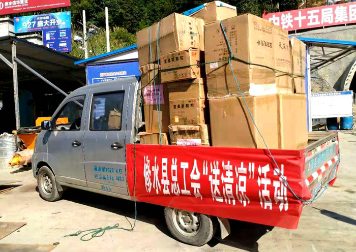 余小明一行到七里山被隧道口慰問該項目部干部職工和農(nóng)民工?,F(xiàn)場給每人發(fā)了人丹、十滴水、夏桑菊、風(fēng)油精、綠豆、毛巾等防暑降溫物品,并與大家親切握手交談。他說,目前正是盛夏持續(xù)37度左右的高溫天氣,大家依然堅守崗位,揮汗如雨,感謝十五局職工為修水縣公路建設(shè)和經(jīng)濟(jì)發(fā)展付出的辛勤勞動和汗水。他叮囑在場的項目部領(lǐng)導(dǎo),在高溫下,一定要注意做好防暑降溫工作,調(diào)整作息時間,避開高溫時段,要把每個作業(yè)人員的安全和健康放在首位,做到工作與防暑降溫工作同步進(jìn)行,切實維護(hù)和保障廣大職工和農(nóng)民工的健康權(quán)。