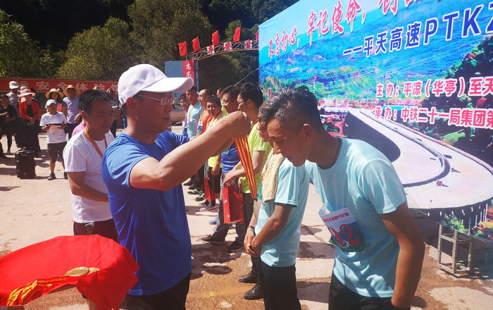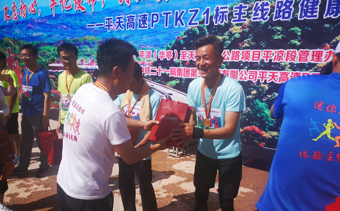 魏惠民為獲獎(jiǎng)選手頒發(fā)獎(jiǎng)品哨聲一響,參跑者相繼以飽滿(mǎn)的熱情和激昂的態(tài)勢(shì)沖出了起跑線(xiàn),踏上了征程。在比賽過(guò)程中,項(xiàng)目員工呈現(xiàn)了挑戰(zhàn)自我、永不放棄的精神,大家一路相互鼓勵(lì),齊頭并進(jìn),最終全部完成比賽,充分展現(xiàn)了鐵建人不畏艱難團(tuán)結(jié)一致的優(yōu)良精神。