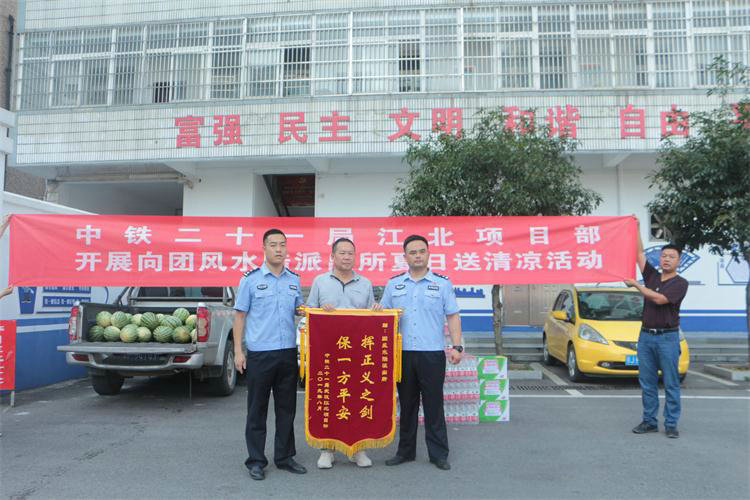 8月5日,中鐵二十一局一公司武漢江北項(xiàng)目部到湖北省黃岡市團(tuán)風(fēng)縣水陸派出所開(kāi)展了“夏日炎炎送清涼,共建警企一家親”暑期慰問(wèn)活動(dòng),為派出所贈(zèng)送了感謝錦旗,感謝派出所一直以來(lái)對(duì)項(xiàng)目部的幫助。