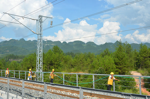 早上7點(diǎn)左右,他帶領(lǐng)著一個(gè)工班,數(shù)十名作業(yè)人員,已經(jīng)來到位于重慶黔江區(qū)的鐵爐堡特大橋上。在鐵路人的隊(duì)伍里,這一批身手矯健的人,正從事著鐵路站后系統(tǒng)中最苦最累也最危險(xiǎn)的工種之一。平日里,工人們沿著梯車敏捷地爬上供電接觸網(wǎng),在高達(dá)七米的高空中憑借自己熟練高超的技藝,進(jìn)行施工作業(yè)。