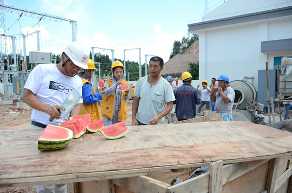 “兄弟們辛苦了,大家先停下手里的活,過來吃幾塊西瓜。”陳春林一進分區(qū)所大門,便隨便找來快木板,拿著隨身帶來的菜刀,開始切西瓜。工友們也毫不客氣,感受項目部送來的絲絲涼意。