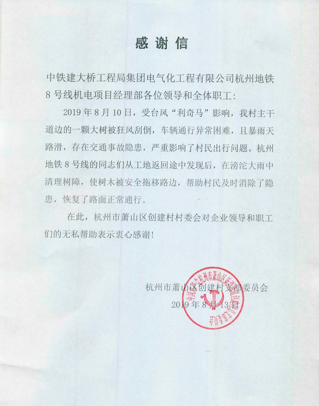 8月13日,中鐵建大橋局電氣化公司杭州地鐵8號線項目部收到杭州市蕭山區(qū)創(chuàng)建村的感謝信,表彰項目干部職工在超強臺風“利奇馬”侵襲的關鍵時刻,用實際行動主動協(xié)助地方“抗臺風”,幫助村民清除樹障,表示誠摯感謝。