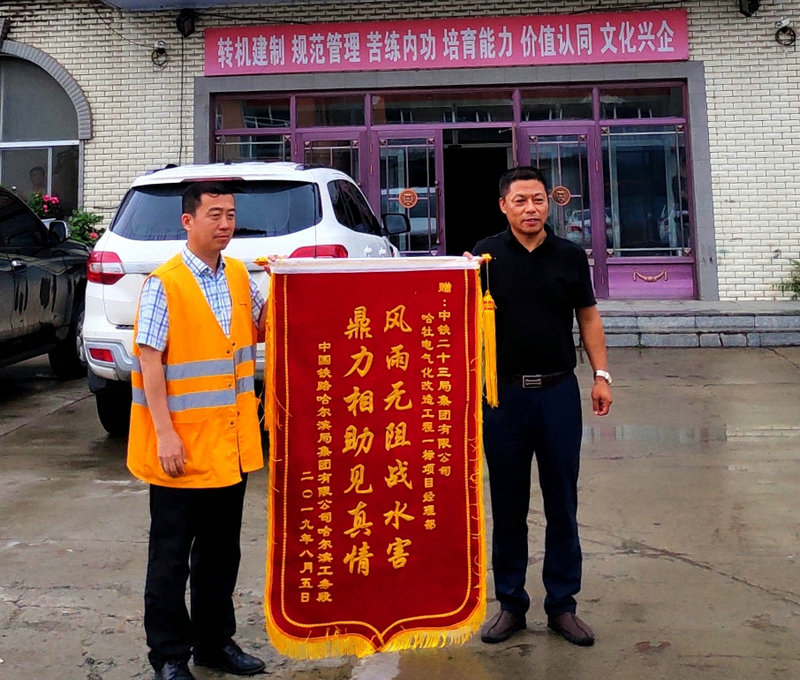 8月22日,中國鐵路哈爾濱局集團有限公司哈爾濱工務(wù)段副段長李軼群將“風雨無阻戰(zhàn)水害、鼎力相助見真情”錦旗專程送到中鐵二十三局哈牡項目部表達感激之情。