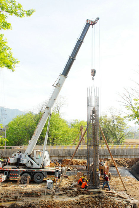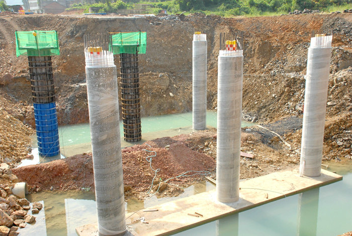 由中鐵十五局集團(tuán)公司承建的江西修水公路擴(kuò)建項(xiàng)目全長(zhǎng)9.188公里,主要工程:一座隧道、2座小橋、28座涵洞、100萬(wàn)立方土石方。其中竹坪橋長(zhǎng)37米、寬40米、4米高的橋墩6個(gè)。杭口橋長(zhǎng)44米、寬40米,8米高的橋墩12個(gè)。這兩座橋與243米長(zhǎng)的七里山北隧道,被業(yè)主列為全標(biāo)段重點(diǎn),項(xiàng)目部非常重視橋隧的施工。為保證兩橋施工的有序推進(jìn),項(xiàng)目部首先在竹坪和杭口兩座橋一側(cè)架起可承載幾臺(tái)大貨車(chē)重壓的鋼便橋,兩端延伸的路面全是鋼筋混凝土結(jié)構(gòu)。同時(shí)安裝了橋欄和安全防護(hù)、警示設(shè)施,經(jīng)橋梁專(zhuān)家檢測(cè),具備通車(chē)條件后,在交警的配合下,川流不息的車(chē)輛全部改道,然后實(shí)施破拆原橋,在新址上挖基、鉆孔、下鋼筋籠、灌注等一系列動(dòng)作。從4月份開(kāi)始組織施工隊(duì)伍作業(yè)到9月中旬,該項(xiàng)目部克服地下暗洞、大涌水等重重困難,橋墩拔地而起,臺(tái)帽澆筑完畢,具備了架梁條件。