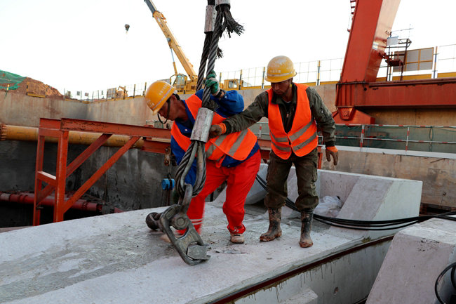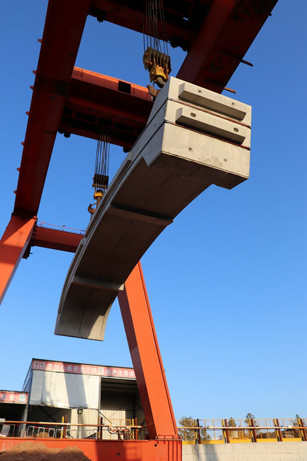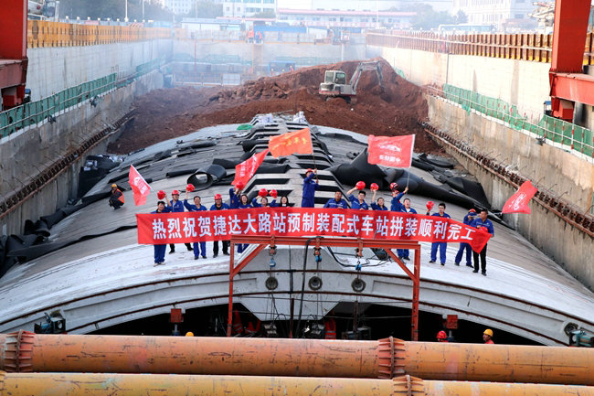 9月25日,17點30分,一片重達(dá)54.3噸、長10.057米的混凝土預(yù)制件E塊,在80T+80T龍門吊的吊裝下,在現(xiàn)場技術(shù)人員的精心指揮下,精準(zhǔn)落座在拼裝臺車上,工人師傅迅即展開調(diào)整就位。至此宣告,由中鐵十四局集團(tuán)承建的長春地鐵2號線西延線捷達(dá)大路站預(yù)制裝配式車站拼裝順利完工。頓時,鞭炮聲和歡呼聲在施工現(xiàn)場響成一片......