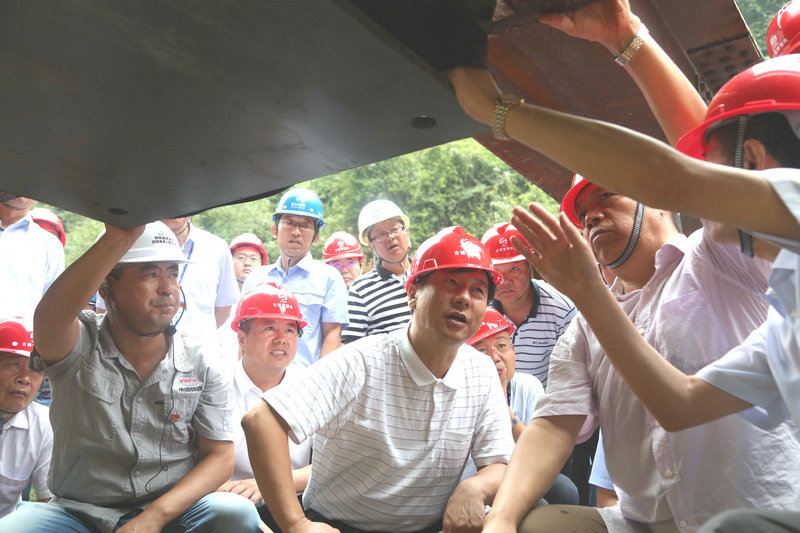 1、陜西省交通運輸廳副廳長黨延兵、陜西省交通設(shè)計院副院長馬保林在中鐵十八局集團(tuán)二公司西鎮(zhèn)項目經(jīng)理周艇陪同下現(xiàn)場觀摩鋼梁支座安裝工藝(丁迪 攝)