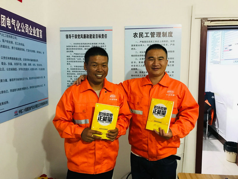 農(nóng)民工兄弟捧著贈送的書籍喜悅地說,努力工作,為項目貢獻(xiàn)力量